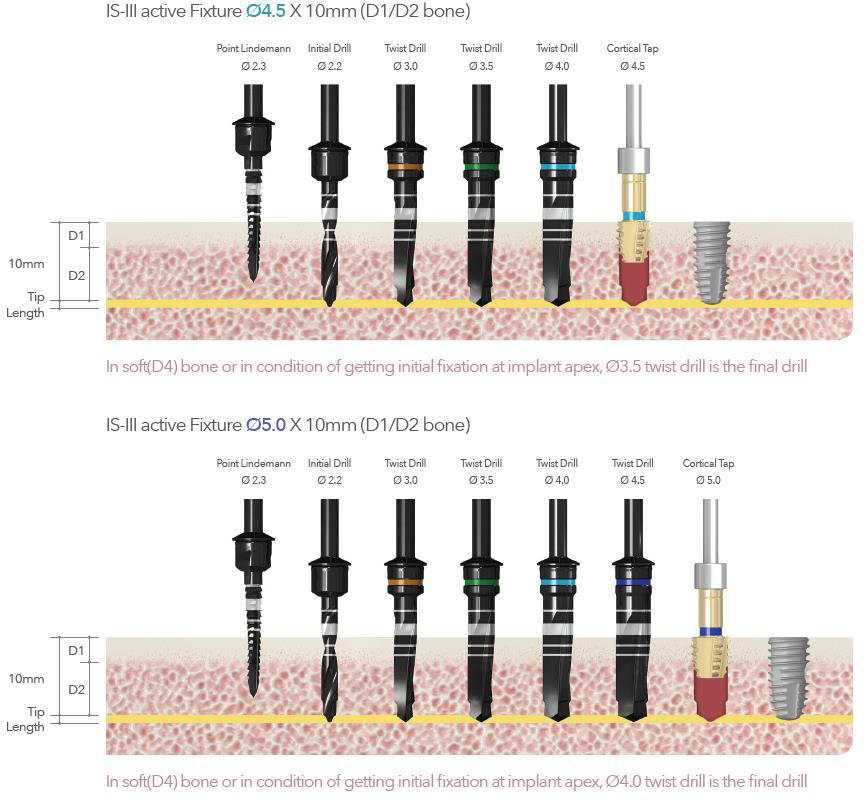 Хирургичен протокол на системата за диаметър на импланта от 4.0 мм. Пробива се с калиброващи фрези, като последната калиброваща фреза е с диаметър от 3.5 милиметра - с 0.5 милиметра по-малко от диаметъра на импланта. След това се пробива с костен метчик - метчик е руският термин, на български се говори за резбонарез. Идеята е костният метчик да създаде резба, в която да завинти зъбният имплант. Разбира се, такава резба може да се създаде и при завинтването на самия имплант (в различни области на машиностроенето се използват различни самонарезни винтове), но с предварителната подготовка на мястото на импланта се постига полезен ефект - може да се контролира въртящият момент, с който се поставя имплантът и така да се осигурят максимално добри възможности за протичане на оздравителния процес.