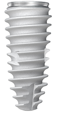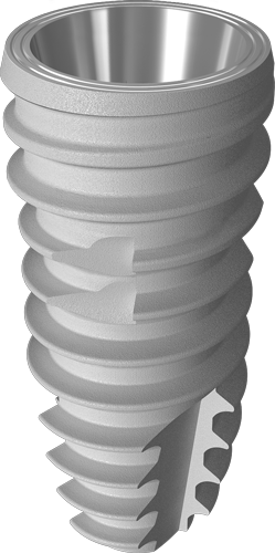 Схема на зъбен имплант от серията IS2 на Neobiotech. Вижда се геометрията на имплантатната платформа, която е цилиндрична в областта на тялото и заоблена като конус в областта на върха на импланта. Някъде до 2002 - 2003 година почти всички имплантатни системи в света бяха с цилиндрична форна на вътрекостната част; след този период като по-удачна се наложи коничната форма. Оказа се че цилиндричната форма натоварва костта повече в напречна посока, докато коничната - в надлъжно направление. И тъй като липсата на патологични натоварвания, водещи до костна резорбция, е ключова по отношение на успеваемостта на лечението с импланти в дългосрочен план, повечето производители на зъбни импланти започнаха да прилагат конични форми. В резултат на това възникна нов проблем - коничната форма предразполага към компресия на костта при завинтване на импланта в нея; от своя страна тази компресия води до нарушено кръвоснабдяване с последваща опасност от костна резорбция. Разбира се, при завинтване на вътрекостната част с по-голяма сила и последващо връщане назад компресията намалява, но се губи първичната стабилност на импланта. А последната пък е ключова по отношение на краткосрочната успеваемост при лечението с импланти. Поради това се стигна до компромисно решение, съчетаващо предимствата на двете форми на имплантите - в областта на апекса зъбните импланти са конични, а в областта на шийката и средната част - цилиндрични. Така въртящият момент (торк) при поставяне на импланта може да се контролира - при връщане с 1/4 или 1/2 оборот назад имплантът не губи своята първична стабилност, тъй като цилиндричната му част го фиксира в челюстната кост.
