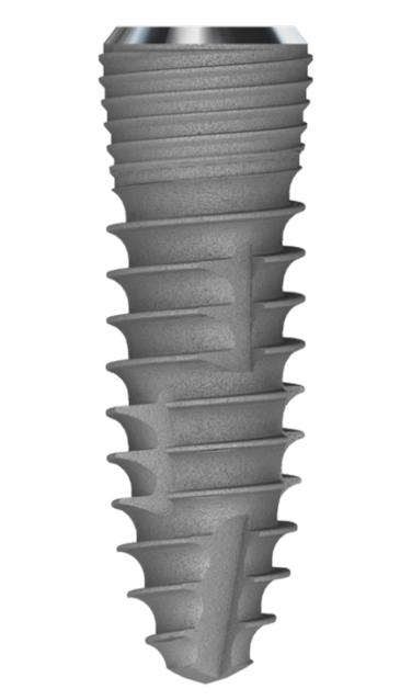 Схема на зъбен имплант от серията IS2 на Neobiotech. Вижда се геометрията на имплантатната платформа, която е цилиндрична в областта на тялото и заоблена като конус в областта на върха на импланта. Някъде до 2002 - 2003 година почти всички имплантатни системи в света бяха с цилиндрична форна на вътрекостната част; след този период като по-удачна се наложи коничната форма. Оказа се че цилиндричната форма натоварва костта повече в напречна посока, докато коничната - в надлъжно направление. И тъй като липсата на патологични натоварвания, водещи до костна резорбция, е ключова по отношение на успеваемостта на лечението с импланти в дългосрочен план, повечето производители на зъбни импланти започнаха да прилагат конични форми. В резултат на това възникна нов проблем - коничната форма предразполага към компресия на костта при завинтване на импланта в нея; от своя страна тази компресия води до нарушено кръвоснабдяване с последваща опасност от костна резорбция. Разбира се, при завинтване на вътрекостната част с по-голяма сила и последващо връщане назад компресията намалява, но се губи първичната стабилност на импланта. А последната пък е ключова по отношение на краткосрочната успеваемост при лечението с импланти. Поради това се стигна до компромисно решение, съчетаващо предимствата на двете форми на имплантите - в областта на апекса зъбните импланти са конични, а в областта на шийката и средната част - цилиндрични. Така въртящият момент (торк) при поставяне на импланта може да се контролира - при връщане с 1/4 или 1/2 оборот назад имплантът не губи своята първична стабилност, тъй като цилиндричната му част го фиксира в челюстната кост.