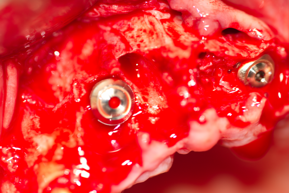 Два зъбни импланта във фронталния участък на горна челюст. Доста посетители на нашия сайт се плашат и понякога дори се ужасяват от кървавите снимки, но всъщност наличието на добро кръвоснабдяване в случая е белег за добра прогноза на лечението с импланти и в този случай се очаква добър оздравителен процес. Обратно, липсата на кървене означава атрофия на челюстната кост, съответно е предпоставка за забавен и усложнен оздравителен процес.