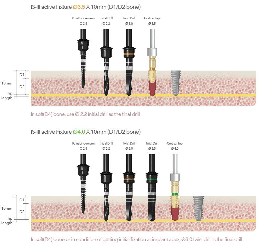 Хирургичен протокол на системата за диаметър на импланта от 4.0 мм. Пробива се с калиброващи фрези, като последната калиброваща фреза е с диаметър от 3.5 милиметра - с 0.5 милиметра по-малко от диаметъра на импланта. След това се пробива с костен метчик - метчик е руският термин, на български се говори за резбонарез. Идеята е костният метчик да създаде резба, в която да завинти зъбният имплант. Разбира се, такава резба може да се създаде и при завинтването на самия имплант (в различни области на машиностроенето се използват различни самонарезни винтове), но с предварителната подготовка на мястото на импланта се постига полезен ефект - може да се контролира въртящият момент, с който се поставя имплантът и така да се осигурят максимално добри възможности за протичане на оздравителния процес.