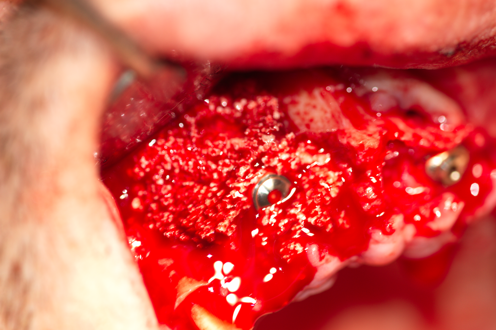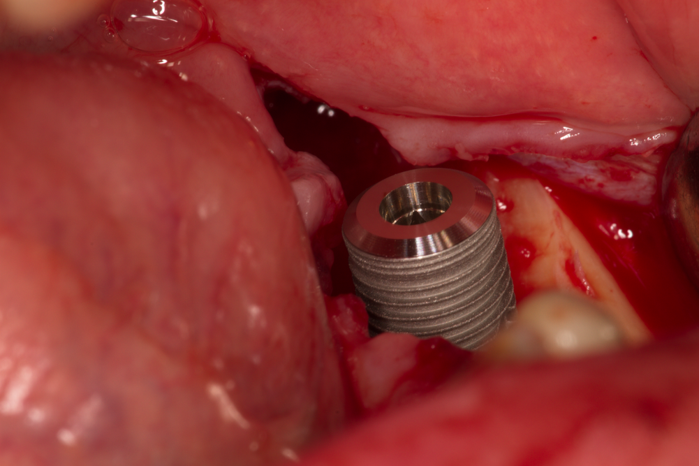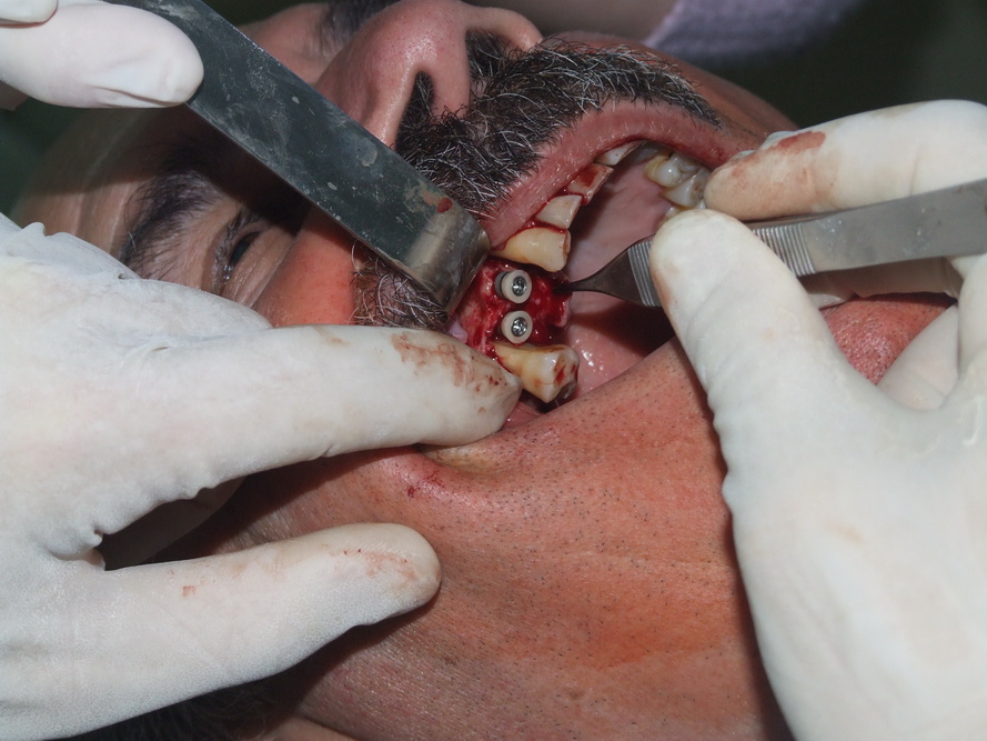 Два зъбни импланта във фронталния участък на горна челюст. Доста посетители на нашия сайт се плашат и понякога дори се ужасяват от кървавите снимки, но всъщност наличието на добро кръвоснабдяване в случая е белег за добра прогноза на лечението с импланти и в този случай се очаква добър оздравителен процес. Обратно, липсата на кървене означава атрофия на челюстната кост, съответно е предпоставка за забавен и усложнен оздравителен процес.